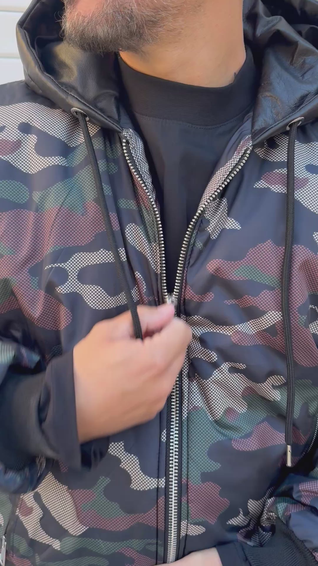 Giubbino mimetico con cappuccio e inserti in pelle